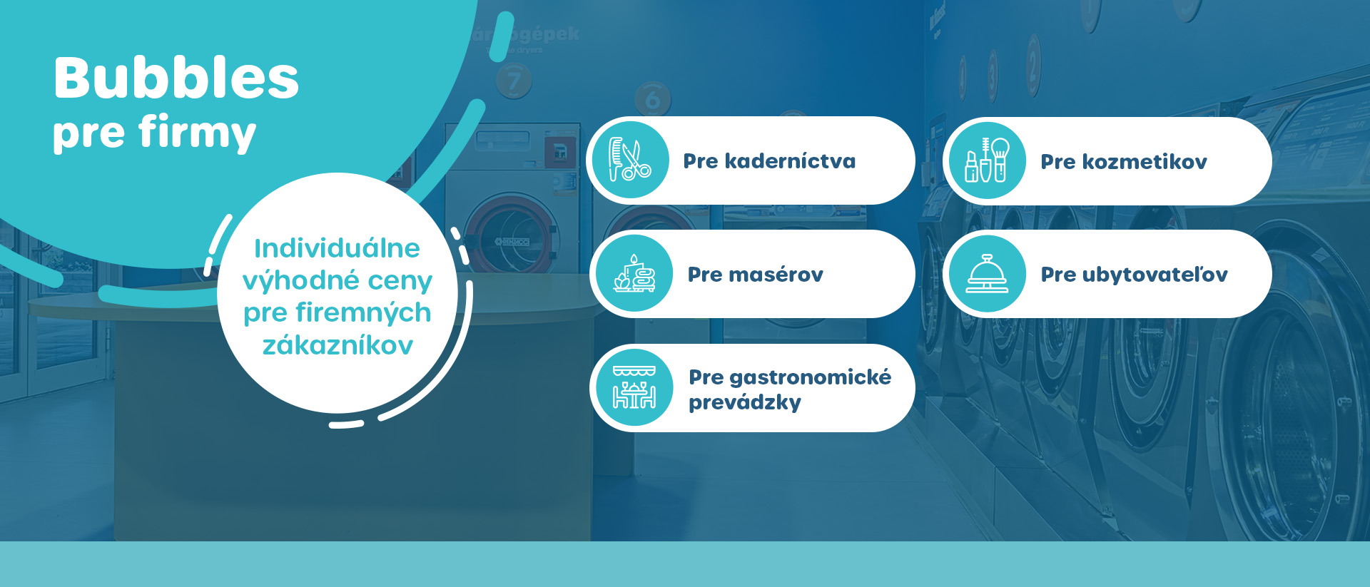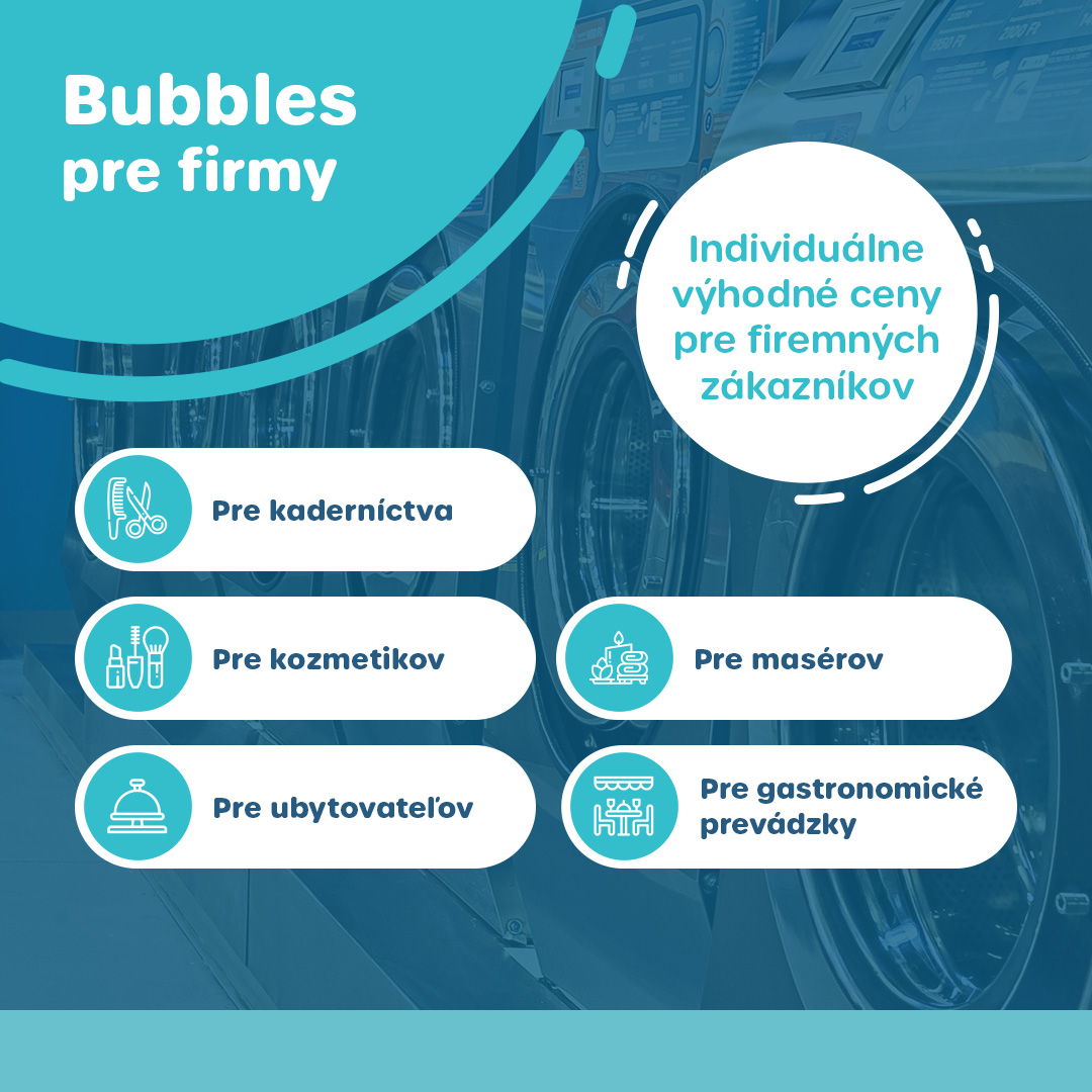 Vedieš podnikanie a pravidelne sa ti hromadí veľa bielizne? Vyber si Bubbles a na mnohých miestach v krajine môžeš jednoducho, vo veľkokapacitných strojoch a s možnosťou účtovateľnosti vyprať a vysušiť bielizeň vzniknutú pri tvojej práci. Môže ísť o pracovné oblečenie, uteráky, posteľnú bielizeň alebo akékoľvek textílie.