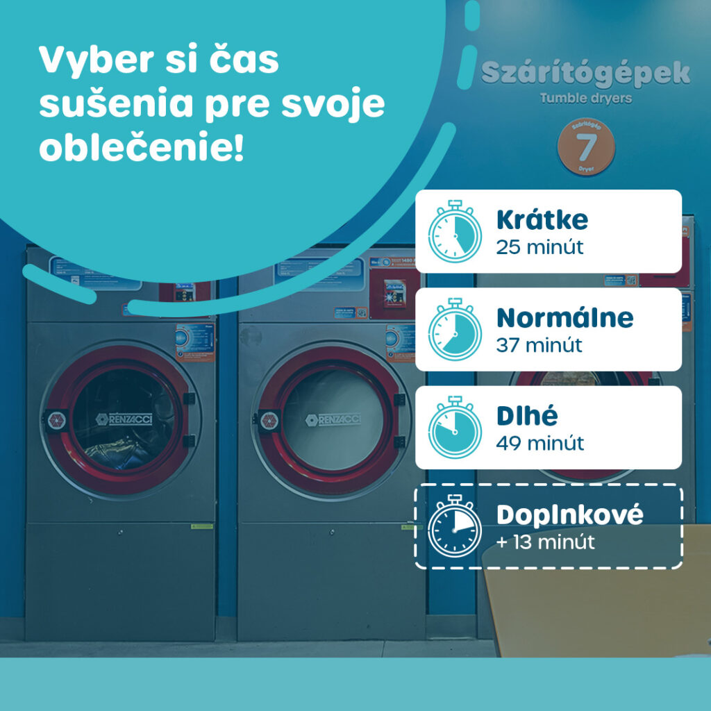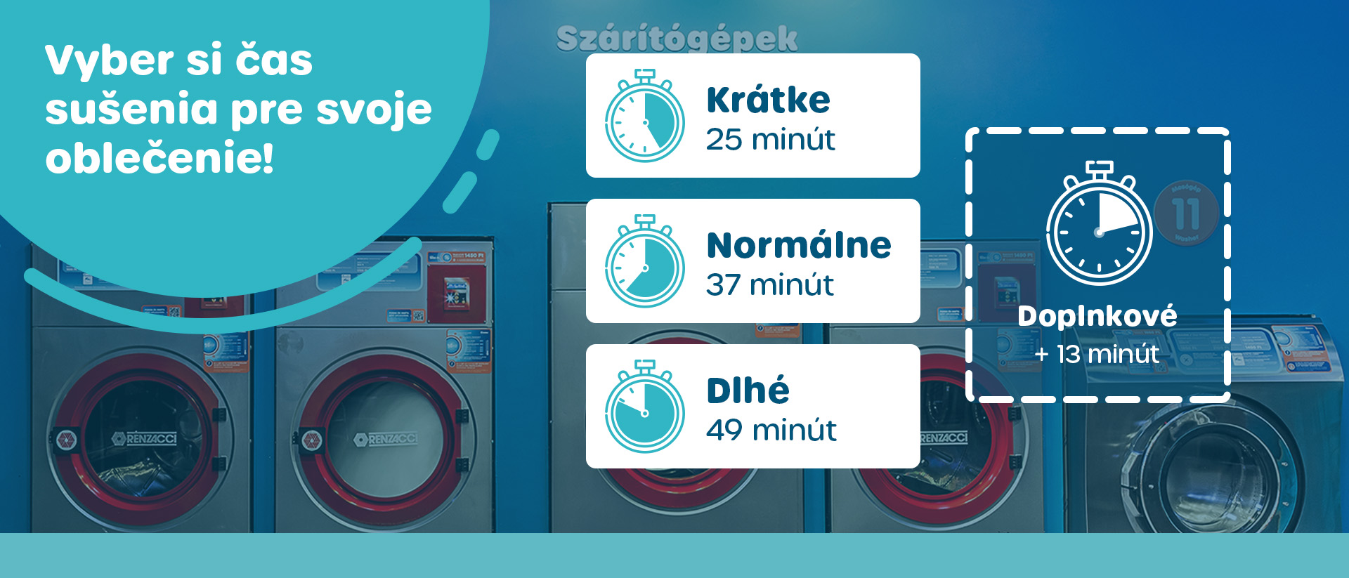 Kratší program je samozrejme cenovo výhodnejší, takže ľahko schnúce textílie môžeš vysušiť lacnejšie.* Pre ťažšie schnúce textílie si môžeš zvoliť dlhší program alebo pridať doplnkový čas po kratšom programe. Ceny sa menia pomerne, takže ani v tomto prípade nie je potrebné kupovať 2 celé sušiace cykly za plnú cenu. *Ceny sušenia sa môžu líšiť podľa prevádzky, aktuálne ceny k programom zobrazuje platobný terminál a aplikácia pri jednotlivých programoch.