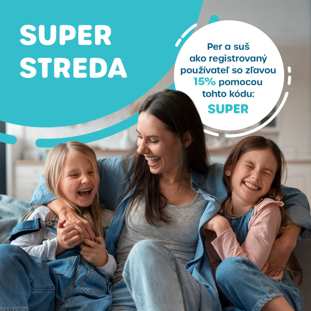 SUPER s kupónovým kódom dostupné každú stredu v označených práčovniach, VÝHRADNE pre REGISTROVANÝCH používateľov.